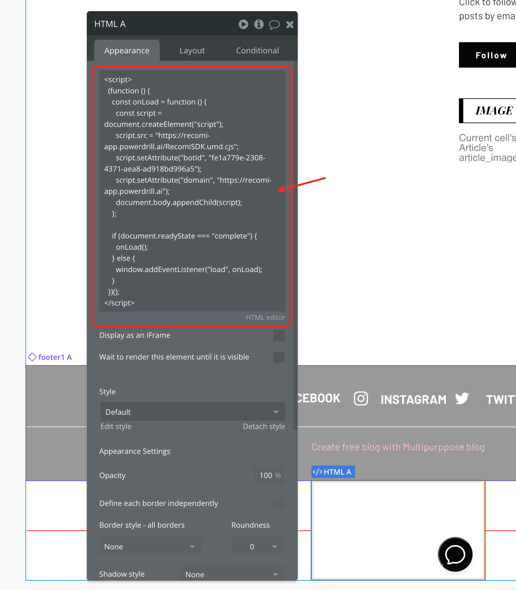 - Paste the copied embed code into the editor. Once done, a floating agent icon should appear on the bottom left of the editor preview.