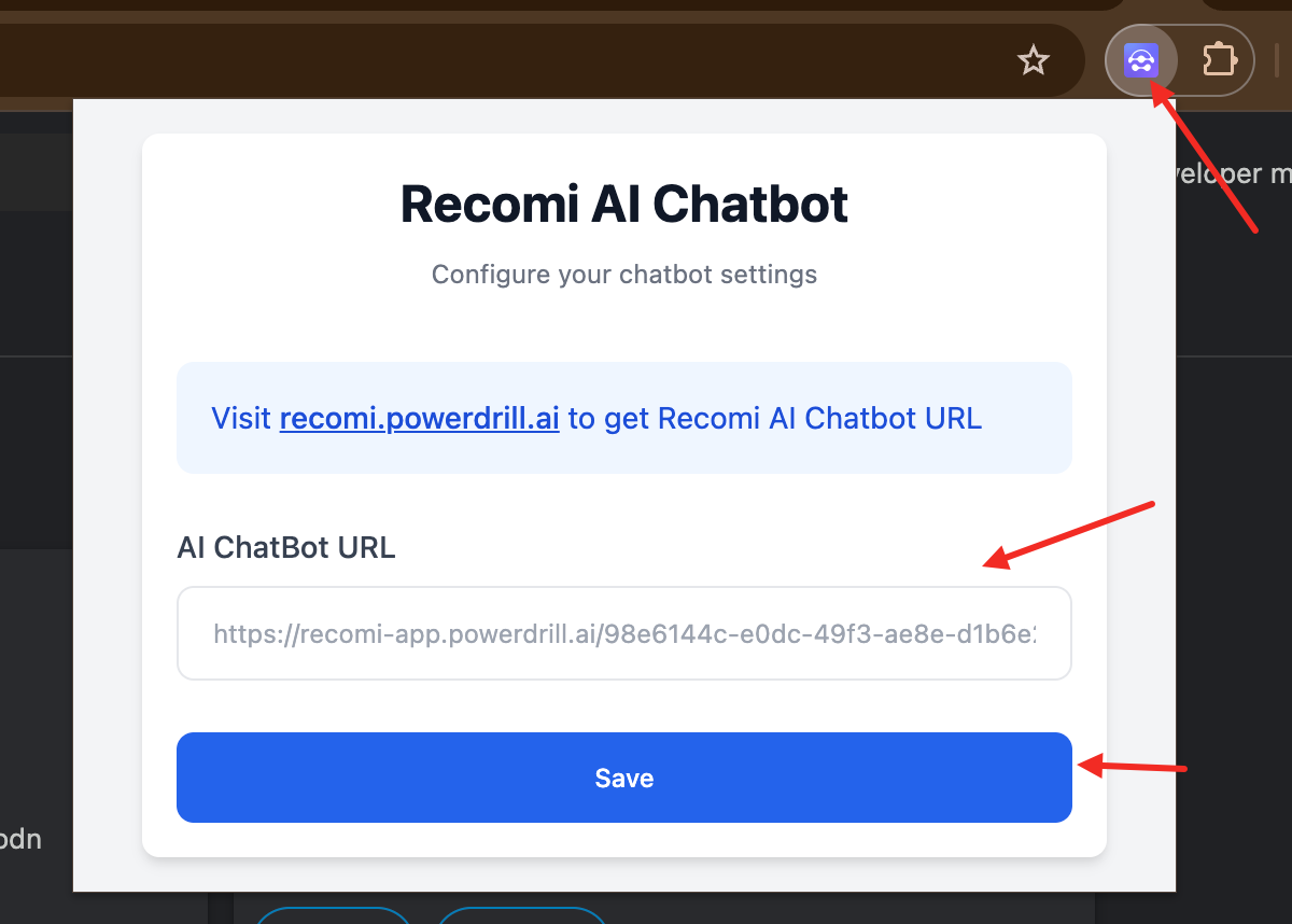 - Recomi AI chatbot floating bar can be loaded normally on any page in Chrome, if you need to change the chatbot, just change the ChatBot URL