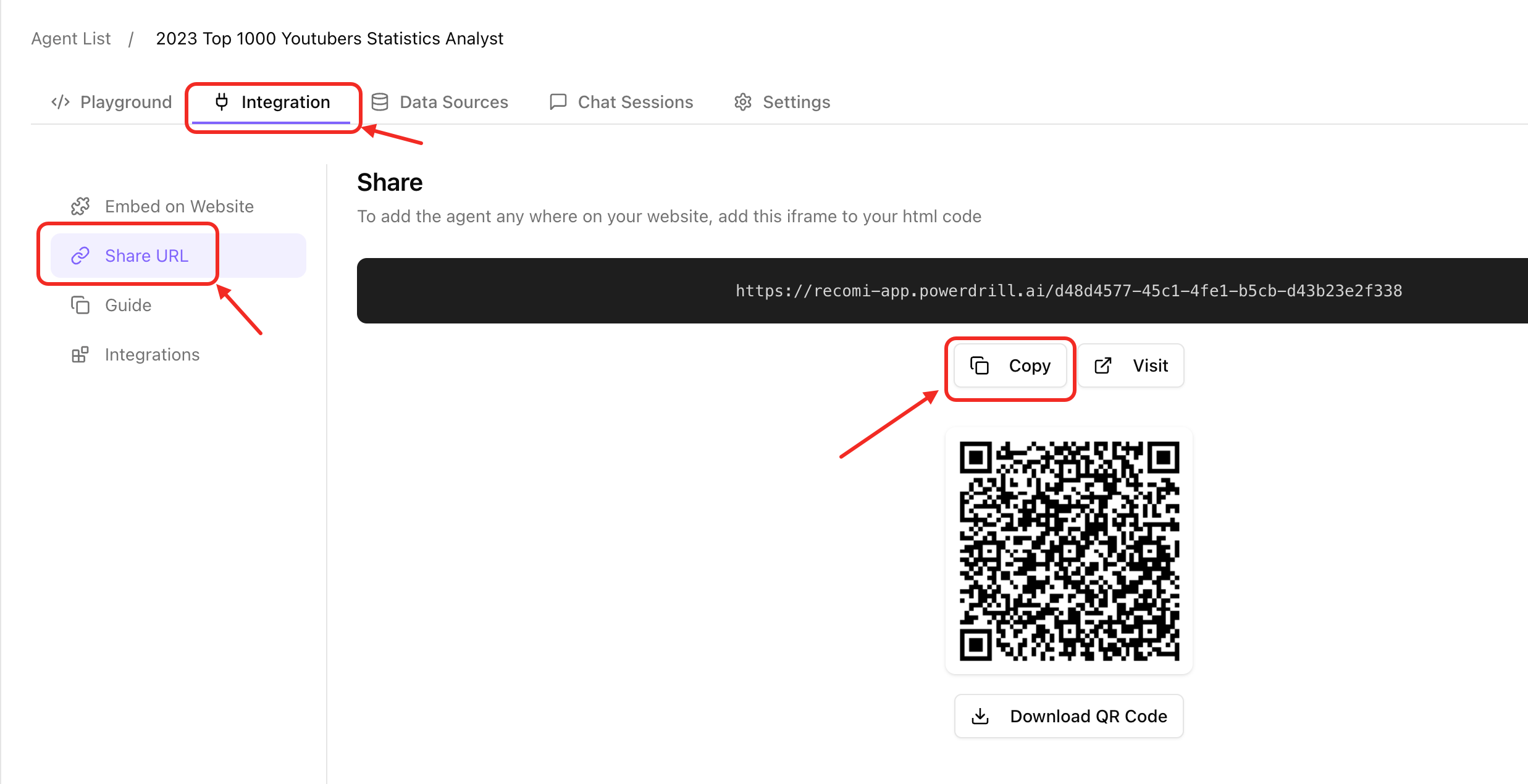 - Create or find your Recomi AI Agent, go to the Agent page -> Integration -> Share URL, click the Copy button to get the ChatBot URL, as shown in the figure