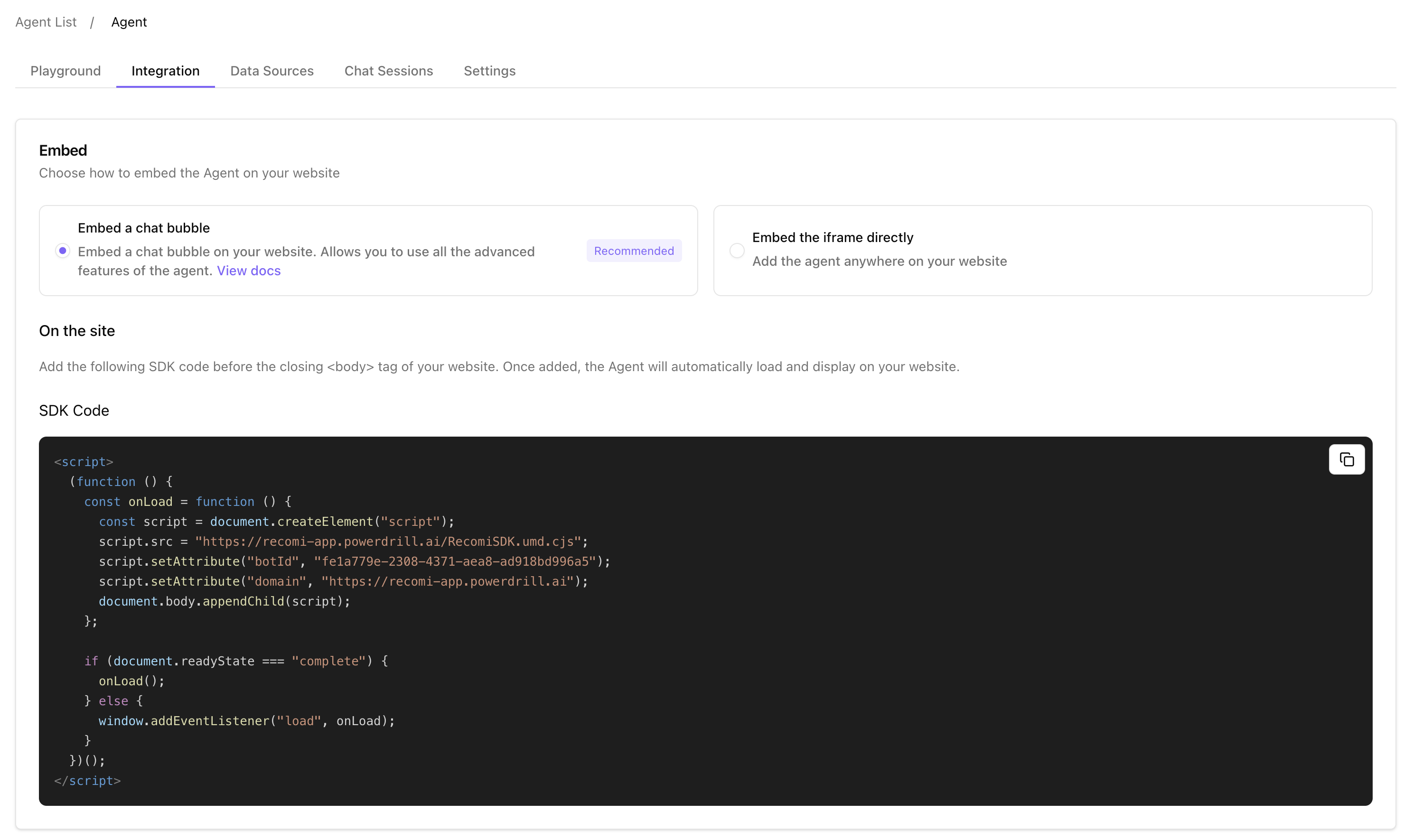- On this page, you will find the option of Embed a chat bubble to Copy Script. Click this button to copy the agent’s embed SDK Code.