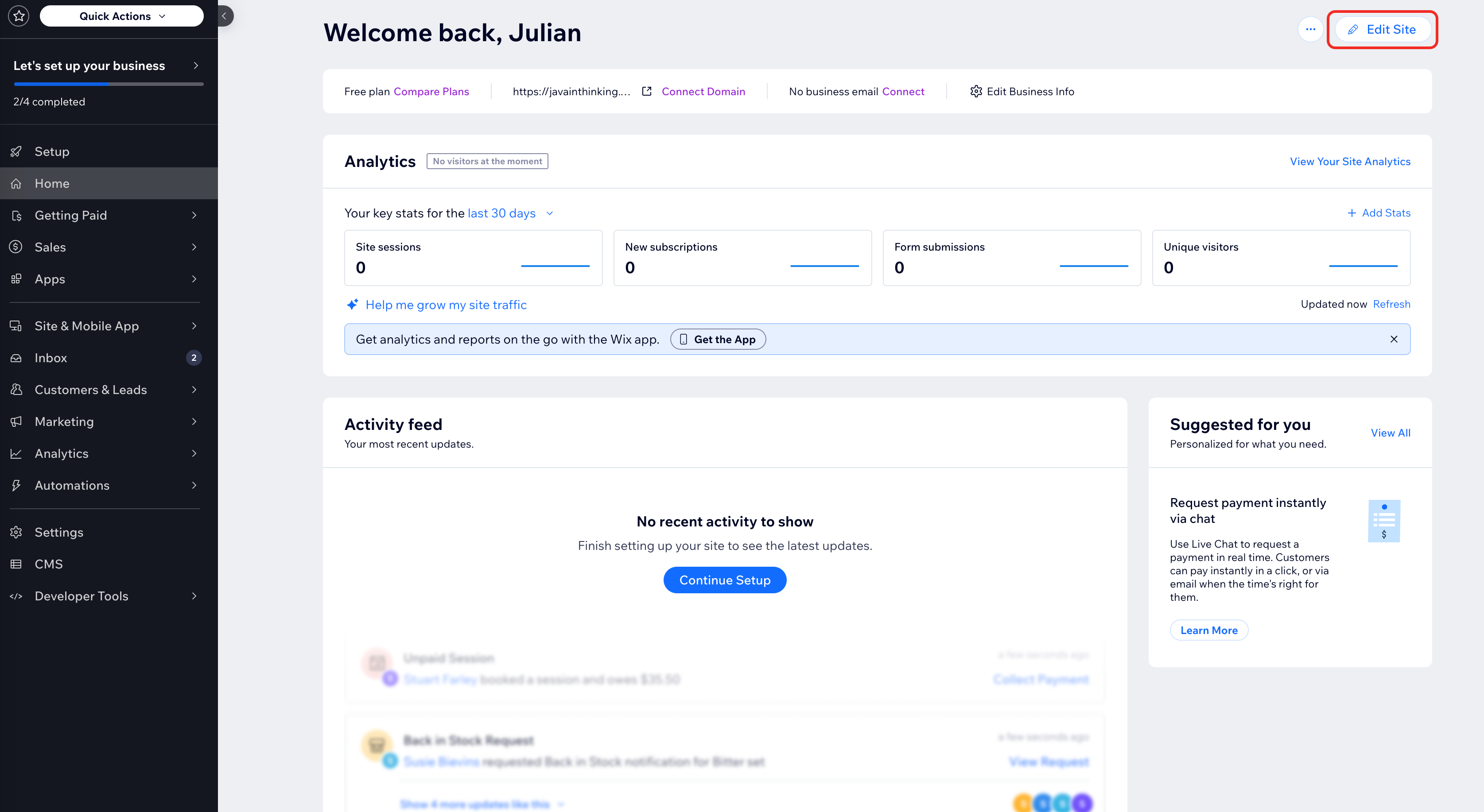 - On your dashboard, locate the site you want to embed and click on Edit Site.