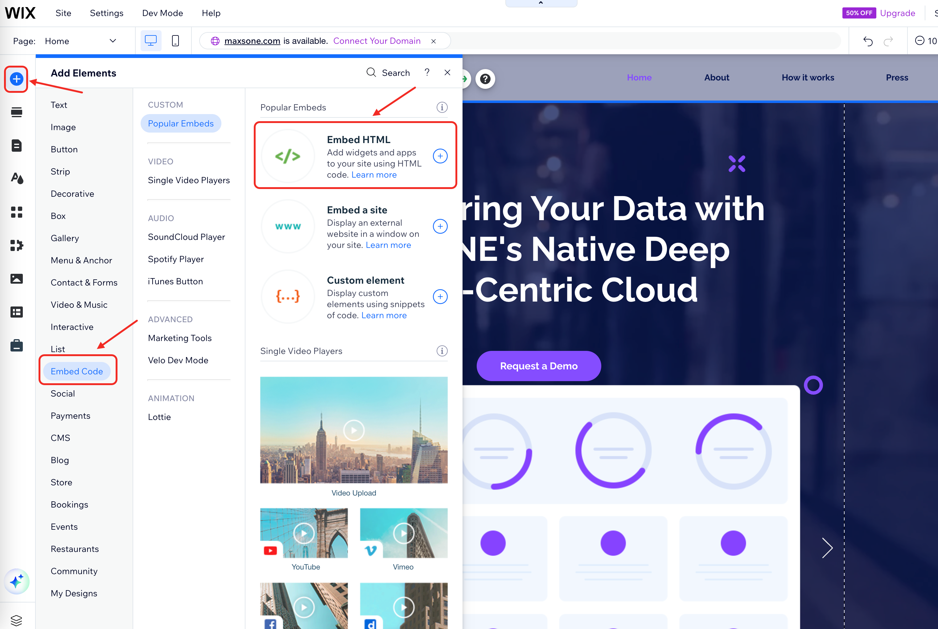 - Click the Add Elements button on the left sidebar of the Wix site editor. Then scroll down to locate and click on Embed Code, followed by Popular Embeds and then Embed HTML.