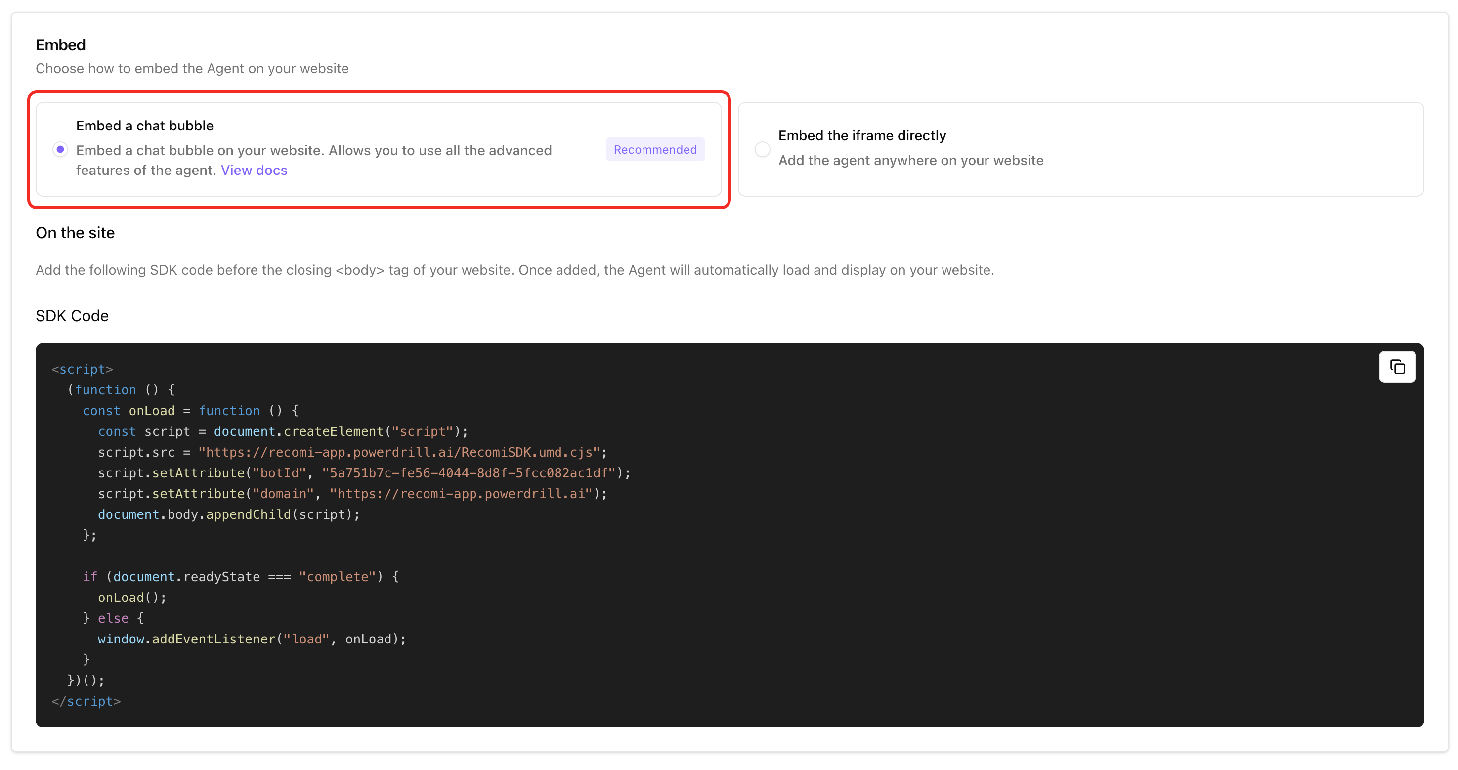 Embedding via Chat Bubble