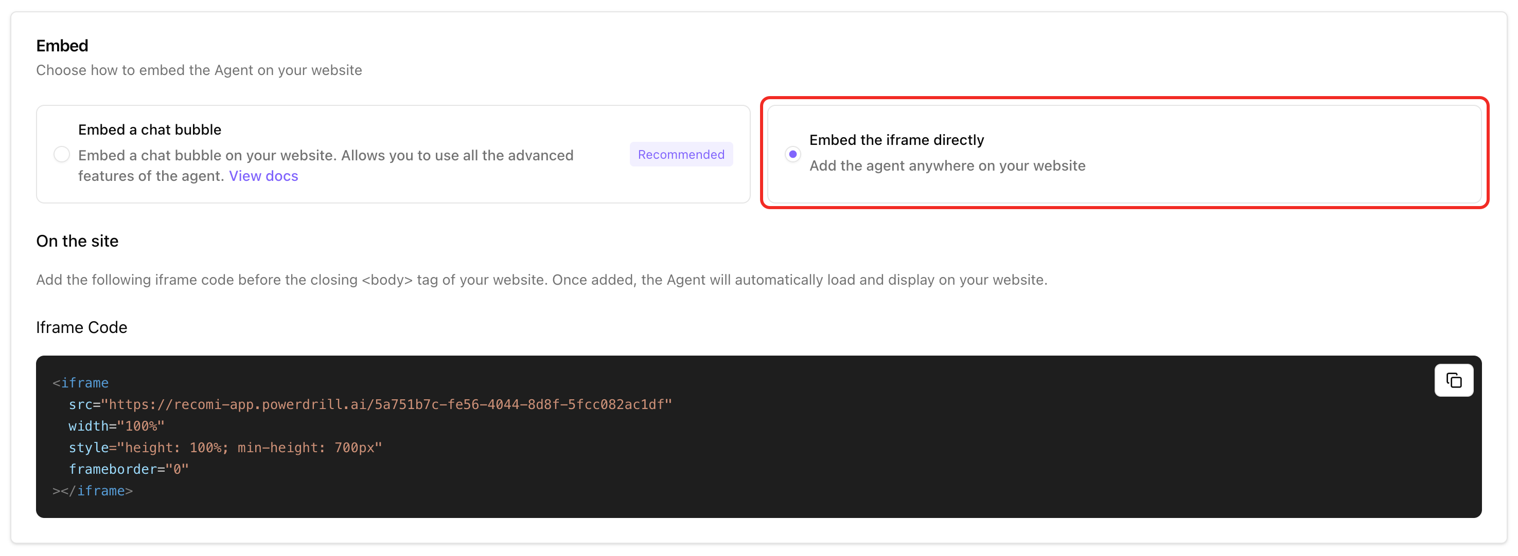 - Use Iframe if you need a fully embedded chat interface with fixed placement and customizable dimensions.